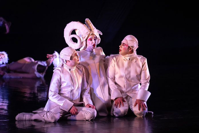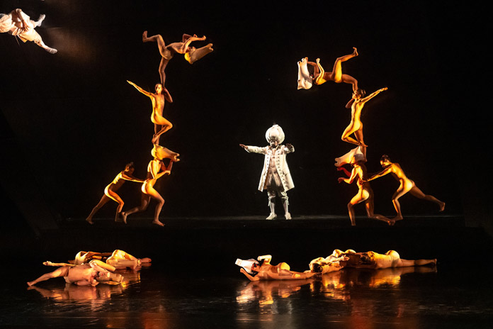 Determinante, nella riuscita complessiva, l’impianto registico di Emiliano Pellisari, che firma regia, scene e coreografie con Mariana Porceddu. I danzatori della compagnia NoGravity trasformano il palcoscenico in un dispositivo illusionistico fondato sull’uso di uno specchio inclinato: i corpi, riflessi mentre si muovono al suolo, appaiono sospesi in uno spazio altro, sottratto alla gravità. L’effetto non è mero virtuosismo tecnico, ma coerente traduzione contemporanea della “maraviglia” barocca, categoria estetica fondativa del ballet de cour. In questo teatro ottico, anche la distinzione tra canto e danza si attenua: i cantanti, talvolta costretti a posture inconsuete, entrano fisicamente nel gioco illusionistico, in un dialogo serrato tra suono e immagine.