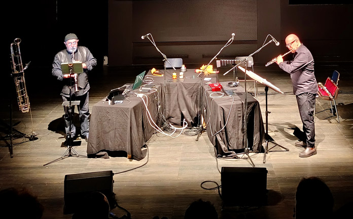 Con Letter Piece #5 – Northern Cities di Shlomowitz, la scena si popola di oggetti, gesti e micro-narrazioni: giocattoli di gomma (inclusa una gallina dal suono sorprendentemente disperato), un clarinetto rivisitato unendo testata e campana e suonato con sordina, richiami per anatre, versi d’upupa, fotografie mimate, pose improvvise, finti sbadigli. È un gioco dadaista fatto di sillabe, onomatopee e movimenti che rispondono l’uno all’altro come frammenti di una partitura visiva. Il duo trasforma questa teatralità in una danza semiseria in cui la leggerezza non scade mai nella caricatura.