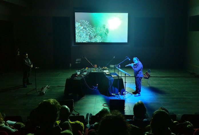 Con Unanime di Justė Janulytė l’atmosfera vira verso una contemplazione acquatica. Il flauto traverso basso di Zurria si moltiplica in sette tracce preregistrate, generando un unico respiro luminoso. Il video immersivo proietta un mondo subacqueo di meduse, bolle che si disperdono, luci blu in dissolvenza: un paesaggio che accompagna la musica verso uno stato quasi di trance.