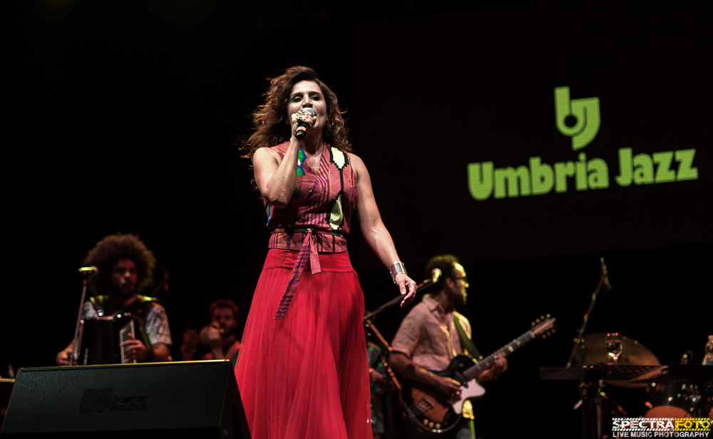 Subito dopo la prima parte dedicata a Gilberto Gil, il secondo concerto all’Arena da spazio ad un’altra Artista del Brasile: Margareth Menezes. Cantante, songwriter, danzatrice, attrice,ha vinto diversi premi e riscosso un successo internazionale grazie a dischi e tour di grandissimo riscontro di pubblico. Partita come cantante nei locali di Bahia ha collaborato con tantissime star della musica brasiliana come Tribalistas, Caetano Veloso, Maria Bethania, Gilberto Gil, Carlinhos Brown solo per citarne alcuni. Ha fatto il suo esordio a Umbria Jazz presentando i brani più conosciuti ed apprezzati del suo repertorio: «Faraò» su tutte, ma anche «Alegria da cidade», «Elegibo», «Dandalunda» in un vortice di samba, afrobeat e reggae che hanno letteralmente conquistato la platea dell’Arena Santa Giuliana.