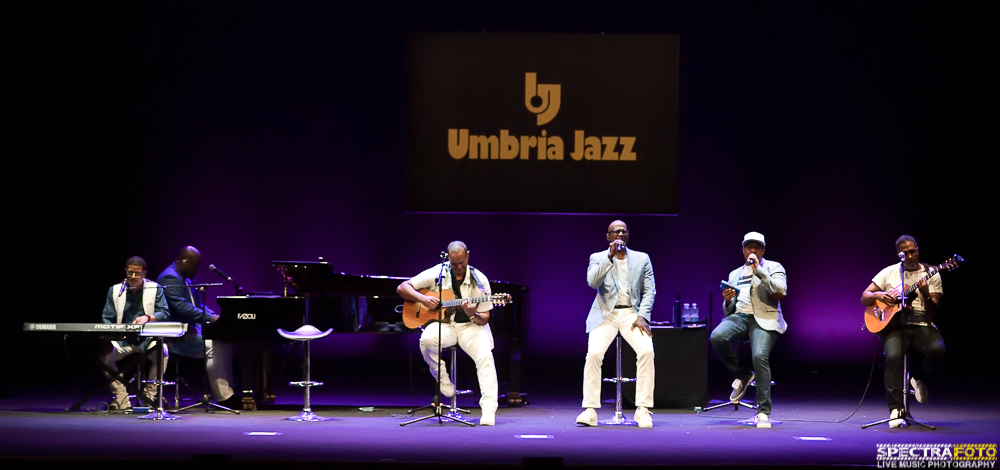 Sul palco di sabato notte arrivano i Take Six per rendere omaggio con loro voci straordinarie alla musica di Al Jarreau, un gruppo straordinario nato nel 1987in Alabama, senza dubbio il piu famoso, premiato e amato gruppo “a cappella” della storia del jazz, capaci di conquistare il pubblico di Umbria Jazz con il loro sofisticato e coinvolgente mix di soul, gospel, swing. Trent’anni di carriera, basati su valori, come loro stessi dichiarano sul palco del Teatro, di fede, amicizia, rispetto e amore per la musica, duranti i quali hanno vinto dieci Grammy e dieci Dove Award e collaborato con nomi del calibro di Ella Fitzgerald, Steve Wonder, Ray Charles, hanno entusiasmato il pubblico, nonostante l’ora tarda, con bellissime interpretazione delle più belle canzoni di Al Jarreau, insieme ad una strepitosa “Overjoed” da brividi e, a conclusione del concerto stesso, una versione di “Alleluja” che ha suscitato una meritatissima standing ovation e un lunghissimo applauso da parte di tutto il pubblico presente.