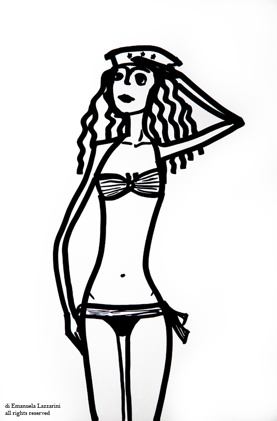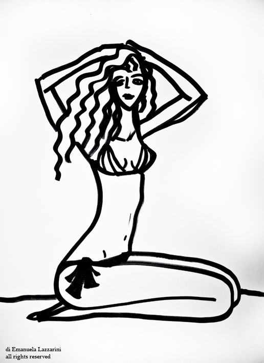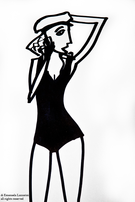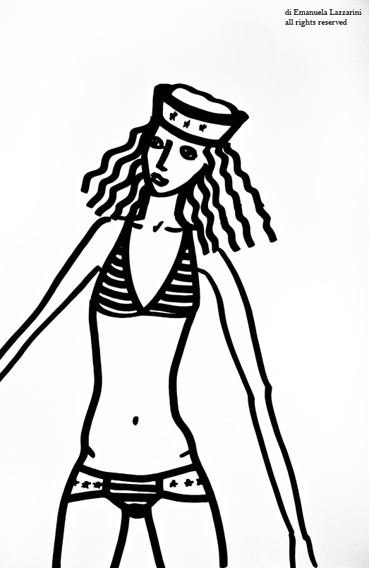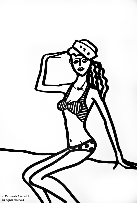 Il mare è la cornice immaginaria che fa da sfondo a queste illustrazioni. Il bianco e nero e l’impatto grafico che ne risulta, contrasta con la suggestione romantica e sognante suggerita dalle pose che richiamano gli anni 50 e le pin-up. Linee semplici che tendono a sintetizzare la fantasia e al tempo stesso a liberarla.