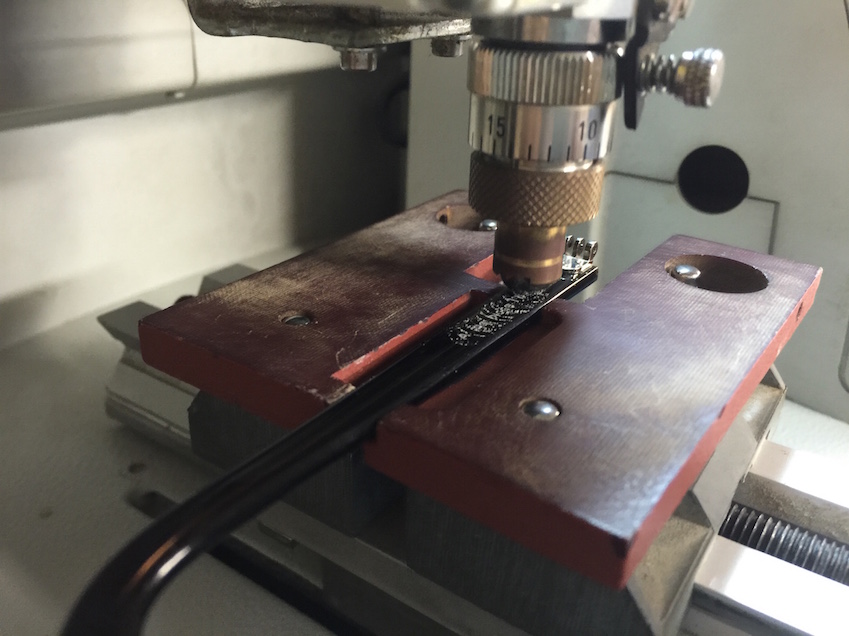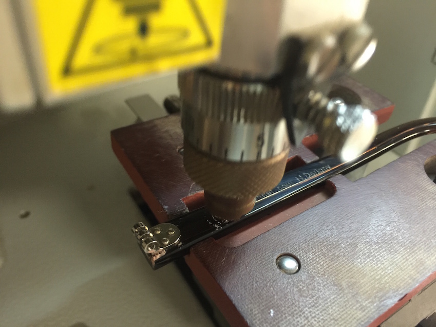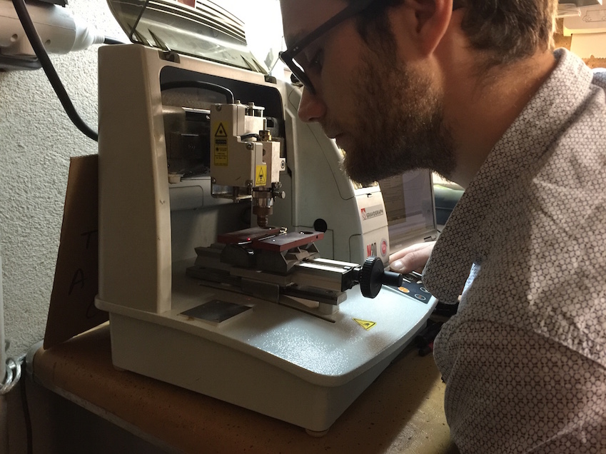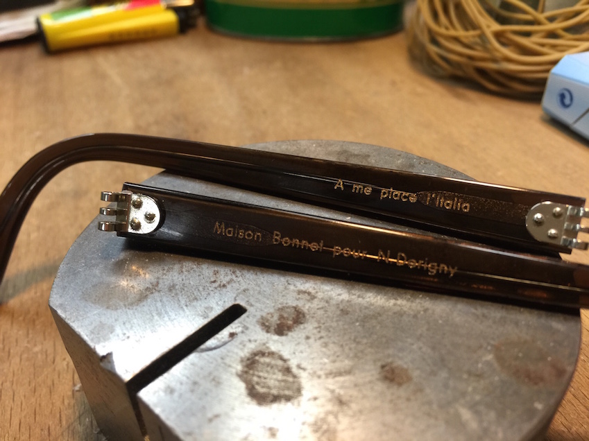 Passo nel secondo ambiente per la centratura delle lenti. Dopo 45 minuti sono libero. Dovrò tornare la mattina seguente per terminare gli ultimi aggiustamenti. Mi domandano anche di riflettere su cosa voglia far incidere su ciascuna delle due aste: ho tutta la notte per rifletterci. Alla fine mi decido per “Maison Bonnet pour N.Derigny” sull’asta destra, e “A me piace l’Italia” sulla sinistra.