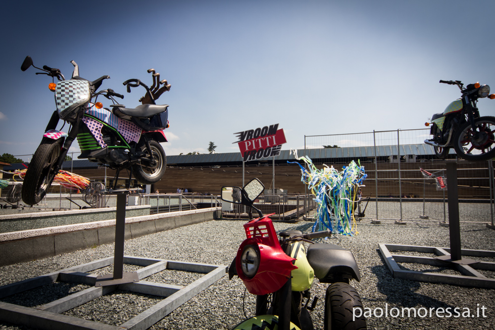VROOM PITTI VROOM è il tema guida di tutte le manifestazioni di questo Luglio 2013, è il senso di libertà che si percepisce, gli stili di vita e le sensazioni legate al mondo della moto. Il tutto è presente in vari spazi della Fortezza con installazioni e riferimenti al mondo dei centauri.