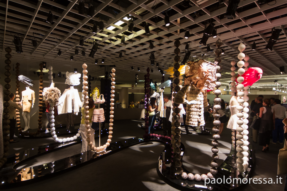 LOVE invece è il tema e titolo dello Spazio Ricerca di questa edizione. Amore all-over, inteso come emozione che guida le nostre scelte di vita, “alla scoperta dell’amore che muove il mondo verso il nuovo e il bello”. Per associazione di idee la parola amore fa subito venire in mente un cuore, ed è proprio con una cascata di cuori che lo spazio ricerca è allestito. Cuori colorati di tendenza, cuori sui quali sono proiettate foto di ispirazione con video e coppie di manichini “innamorati” che si presentano al visitatore mano nella mano, vestiti delle tendenze per l’inverno 2014/15.