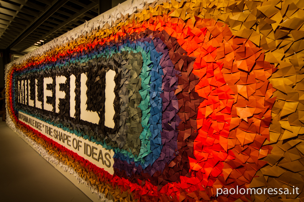 MILLEFILI ha creato uno stand COLORATO. Una parete tappezzata di foglietti di carta colorati di varie forme e dimensioni e aperitivo con verdura fresca e succhi di frutta, ovviamente coloratissimo.
