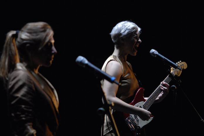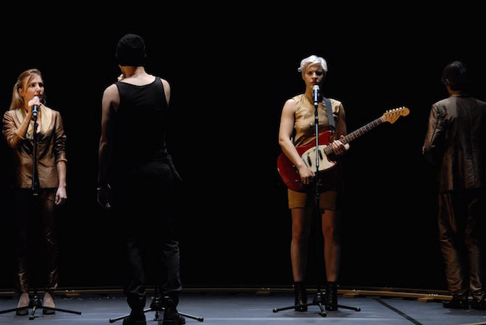 È solo pretesto formale e “cortese”, dunque, maschera che ad altro rinvia, come un elaborato sogno all’indicibile che dietro si cela, l’elaborata storia del giovane pastore Aminta (un esuberante Emanuele Turetta, che sapientemente trae il meglio dalla propria giovinezza), innamorato della bella ninfa Silvia – corpo e voce, che si fa canto e suono sintetico di chitarra, di Matilde Vigna – dopo un bacio rubato “fingendo ch’un’ape avesse morso” il suo labbro; a vincere la “ritrosa fanciullezza” di Silvia, che proprio dall’amore di Aminta trae il suo “odio”, ci si prova l’altra ninfa Dafne (perfetta la voce, dall’invidiabile dizione ed elegantissima avvenenza di Giuliana Bianca Vigogna), di qualche anno più “vecchia”, che le confessa d’esser stata “vinta” da “umiltà, sofferenza, pianti, sospiri e dimandar mercede”, ma invano, mentre Tirsi raccoglierà da amico le confidenze di Aminta: sarà lui, su consiglio di Dafne, a dirgli che Silvia “attende a un fonte, ignuda e sola”, a spingerlo a prender “quello che la fortuna amica t’appresenta”, a vincere le sue titubanze, perché “eguale è il dubbio, e ’l rischio”.