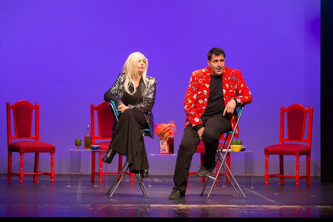 Un oliva dopo l’altra, ciotolina in mano ci si prepara a una serata, stuzzichini e bollicine per comunicare agli amici il divorzio. Quattro sedie rosse, tavolini in plexiglass rigorosamente in tema con il mood del periodo, e lui, e lei sono in scena a discutere, se possa bastare, senza offrire qualcosa di più sostanzioso a chi non ha cenato, solo tartine con patè di olive e salmone. Magari avanzi dello scorso rinfresco per far capire che non è una festa, ma una comunicazione di correttezza alla coppia di amici fedeli. Protagonisti Federico Perrotta e Valentina Olla accolgono i due amici, ed eccoli davanti alla scelta se frequentare l’uno o l’altro, a separazione avvenuta. Non facile, ma il discorso e la comunicazione di questa tristezza coinvolge i quattro, altalenanti tra passione, sentimenti di amore, tradimenti e complicità, battibecchi e pettegolezzi, accomunati da istinti e emotività comuni a tutti, prima o poi con più o meno intensità nella vita.
