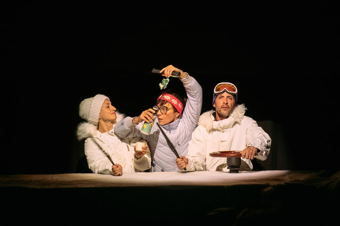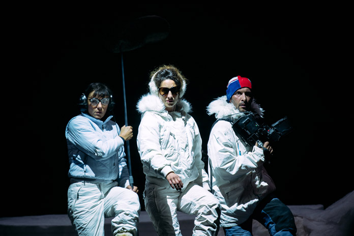 Dimanche è una macchina scenica rigorosa, che diverte senza alleggerire e costruisce, per immagini, una riflessione nitida sul cambiamento climatico. La struttura procede per quadri autonomi, legati dall’incombere dei cataclismi: scioglimento dei ghiacci, innalzamento dei mari, temperature estreme. Non c’è progressione psicologica, ma una pressione costante che si accumula scena dopo scena.