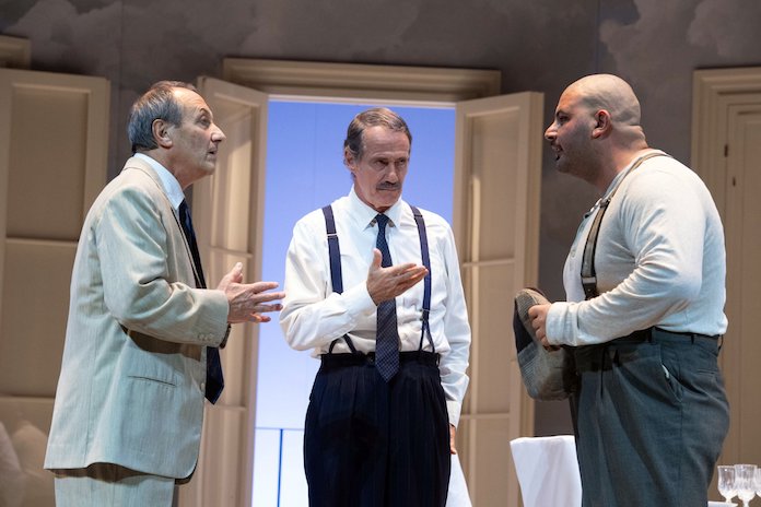 Teresa Saponangelo costruisce una Rosa Priore di grande complessità: evitando con cura la macchietta nevrotica, è una donna ferita che si regge in piedi grazie al rito, non cadendo tuttavia nella trappola della santificazione domestica. Se nel primo atto la sua energia è nervosa, scattante e la cucina diventa il suo campo di battaglia – ogni gesto, dal mescolare il sugo al richiamare la cameriera, al correggere i figli, è attraversato da una tensione trattenuta –, nel secondo atto, durante l’esplosione del conflitto, Saponangelo trova accenti di rara potenza: il monologo di recriminazione non è declamato, è scavato, la voce si incrina, il corpo si piega, ma non cede alla retorica, lasciando intuire una verità dolorosa, quasi brutale, nella sua accusa al marito. Nel terzo atto, alla fine, la riconciliazione è giocata su toni bassi, intimi, e qui l’attrice mostra la sua misura migliore: niente lacrime facili, niente enfasi, solo uno sguardo che finalmente si posa.