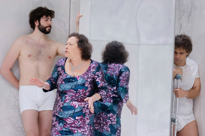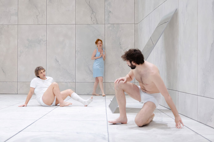 La regia di Lidi concentra tutto in un’unica stanza dalle alte pareti bianche, marmoree, illuminate da luci fredde e neutre. Uno spazio chiuso, quasi clinico, un vero huis clos, che non accoglie ma trattiene. I personaggi appaiono come per magia, spesso dietro uno specchio mobile manovrato da Skipper, figura che abita la scena: riflette i corpi, inchioda la menzogna, coinvolge anche la platea in un gioco di smascheramenti.