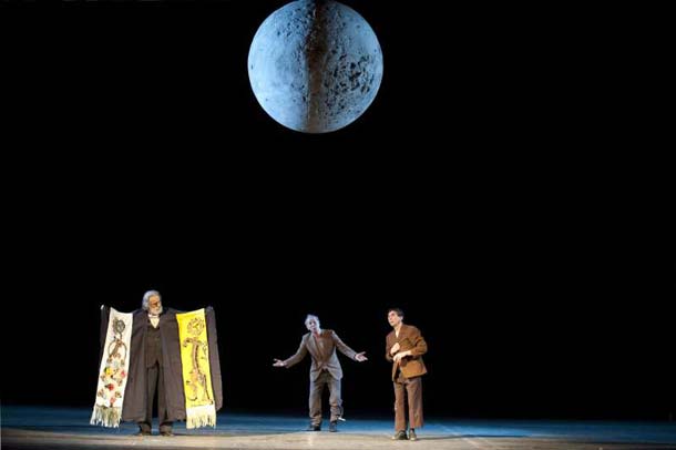 Lucio è uno di questi, creatura assente, fantasma, spirito, o solo ricordo, evocato in un viaggio quasi onirico fra le battute di Pasquale e Crocifisso e poi di Ancilù e Ancilà amabilmente resi da Melino Imparato e Gino Carista, quasi emuli siculi dei beckettiani Didi e Gogo in attesa del loro “Signor Godot”. Sopra di loro giganteggia anche per stazza il sempre grande Mimmo Cuticchio, qui nei panni di un puparo incantatore che ci narra la storia di Lucio, ultimo fra gli uomini, un pazzo o un ingenuo, un uomo o una marionetta che va in cerca della luna, suo opposto irraggiungibile, perché lui è luce del sole e la luna la bacia appena sulle labbra all’aurora.
