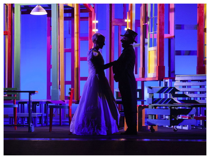 Una struttura policromatica, multi-ingresso, polifunzionale, un sorta di labirinto, quasi un parco giochi per bambini, la scenografia installata nell’arena del Teatro Golden e al grido “Papà, papà….” ecco in scena Charlotte Delong e Jean Marc Labert: l’una in cerca di maternità e l’altro di una birra, un panino o una prostituta com’è tipico di un single: ella la nostra Gaia De Laurentiis in abito da sposa ed egli Ugo Dighero, come il cerimoniale richiede in frak e cilindro.