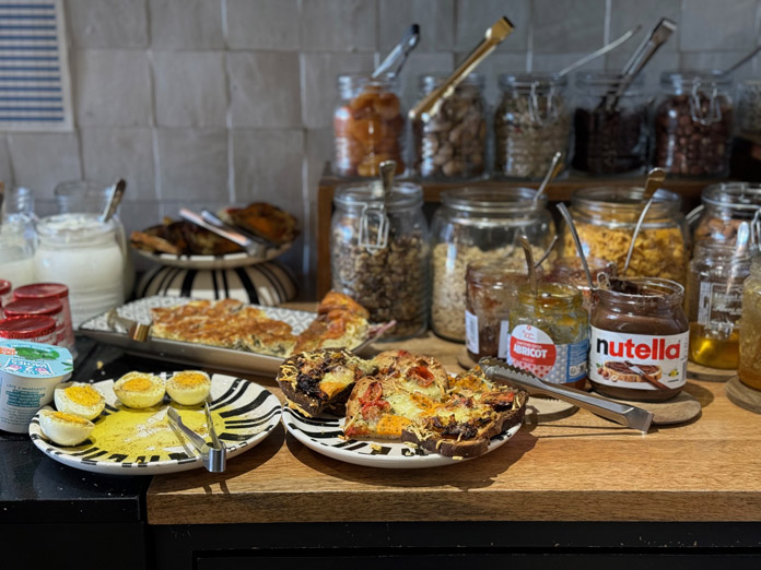 Il buffet della colazione presenta, nella sua semplicità, il profumo di casa, con una cura silenziosa per i dettagli: croissant caldi, pane fresco di boulangerie, marmellate artigianali, granola fatto in casa, frutta di stagione, bevande calde servite con calma, omelette espresse fatte sul momento. E, mentre il mondo si affretta fuori, qui si ha il lusso di iniziare la giornata lentamente.