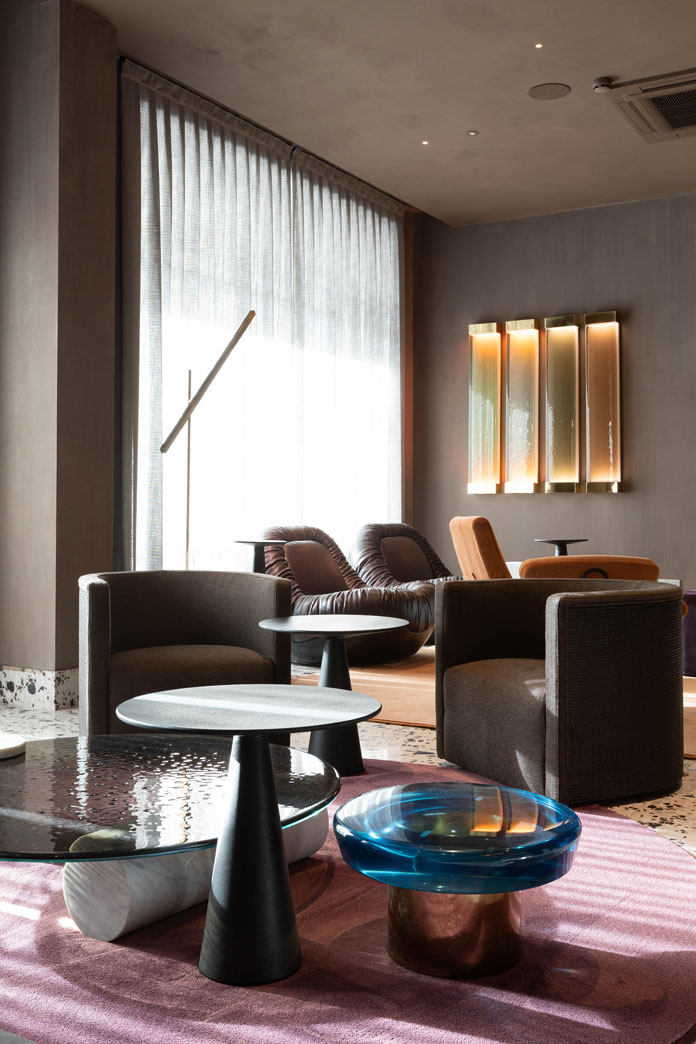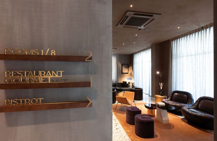 Tutto il palazzo ha una connotazione molto forte dal punto di vista cromatico grazie a una palette cromatica giocata sulle nuance carta da zucchero e mastice che percorrono le quindici camere, il ristorante, le sale d’attesa, i divani, gli arredi.