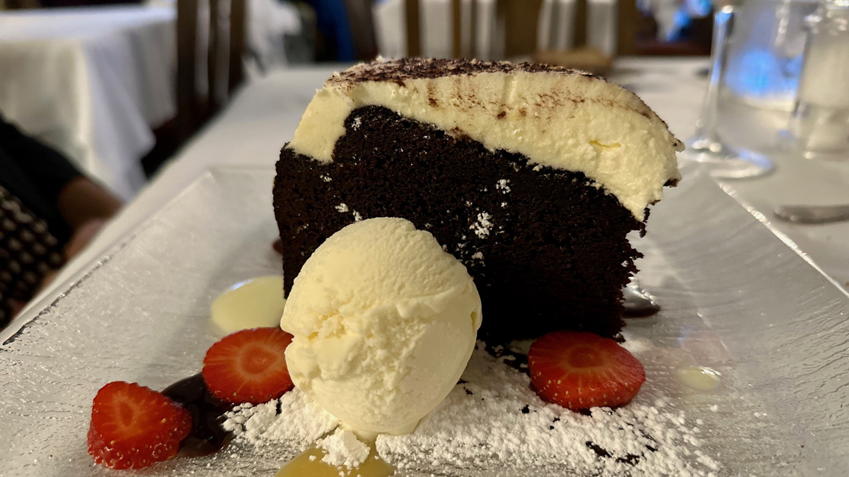 Una rinfrescante pausa con un sorbetto allo champagne, ci guida alla portata principale, un’esperienza gastronomica marina di primordine: rana pescatrice appena pescata servita con sala olandese all’aneto. Un piatto delicato servito con stile, dove la salsa ha aggiunto un tocco di complessità con la cremosità che si sposava elegantemente con l’aroma fresco e leggermente pungente dell’aneto. La cena si conclude con una deliziosa torta al cioccolato alla Guinness fatta in casa, con salsa al cioccolato fondente e gelato alla vaniglia: un finale che ha deliziato il palato con la sua consistenza densa ed il perfetto equilibrio tra dolcezza e robustezza. Una vera cena da re, accompagnata come ogni martedì dalla musica tradizionale dal vivo.