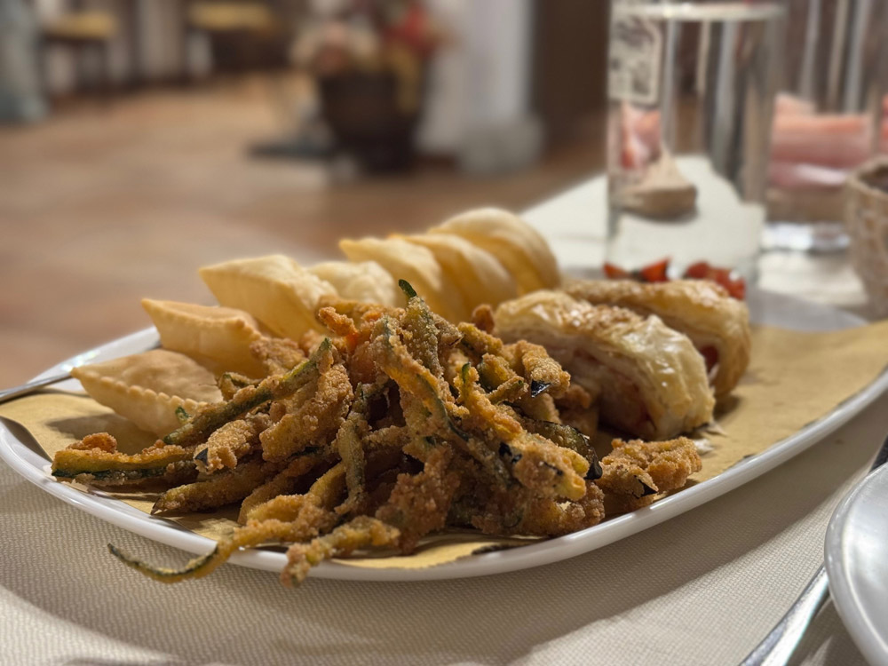 Al mattino la colazione propone una selezione di prodotti dell’azienda agricola e di fornitori locali: miele, confetture, dolci da forno, frutta di stagione, uova, pane e bevande calde. È un momento che riflette la filosofia a chilometro zero della struttura e il legame diretto tra cucina e campi.