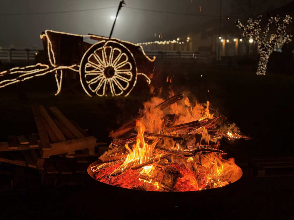 A pochi chilometri da Milano e da Monza, La Camilla si trova in una porzione di Brianza che conserva ancora un rapporto diretto con la terra. Arrivare qui, in una sera d’inverno, significa lasciare alle spalle il traffico urbano per entrare in un paesaggio di prati, alberi e silenzi. Nel cortile, un grande braciere acceso segna l’ingresso e crea un punto di riferimento visivo e conviviale. L’accoglienza prosegue con un breve tragitto a bordo di una golf-car, che accompagna gli ospiti fino alle camere attraversando i viali interni della tenuta.