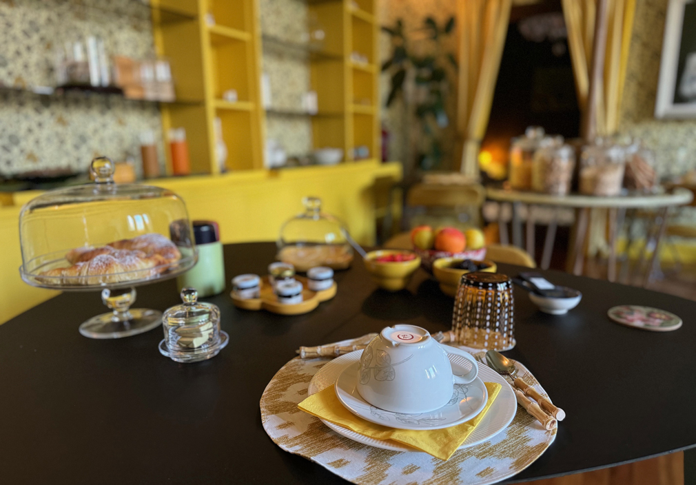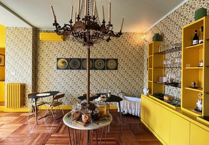 La colazione è servita nella luminosa sala gialla, arredata con parquet e lampadari originali di fine Ottocento. La colazione è un vero e proprio rito, con un ricco buffet che include frutta fresca, succhi di frutta, yogurt, cereali, brioche di pasticceria, biscotti artigianali, fette biscottate, pane fresco, toast, marmellate, miele, affettati e formaggi, con un occhio attento a particolari intolleranze. Caffè, latte, tè o cappuccino vengono serviti al tavolo, insieme agli ingredienti freschi della colazione.