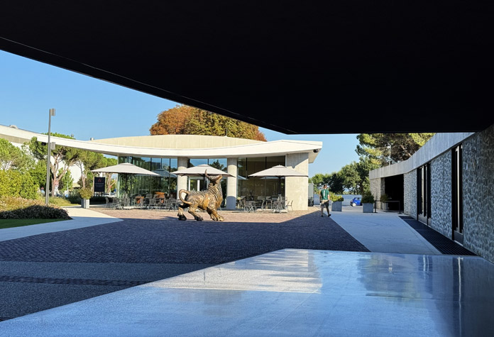 Davanti all’ingresso, un toro imponente in bronzo, ingrandimento di un soprammobile amato in casa, dell’artista Pietro De Tommaso, sembra ricordare che ogni luogo, anche il più elegante, nasce da affetti e memorie personali.