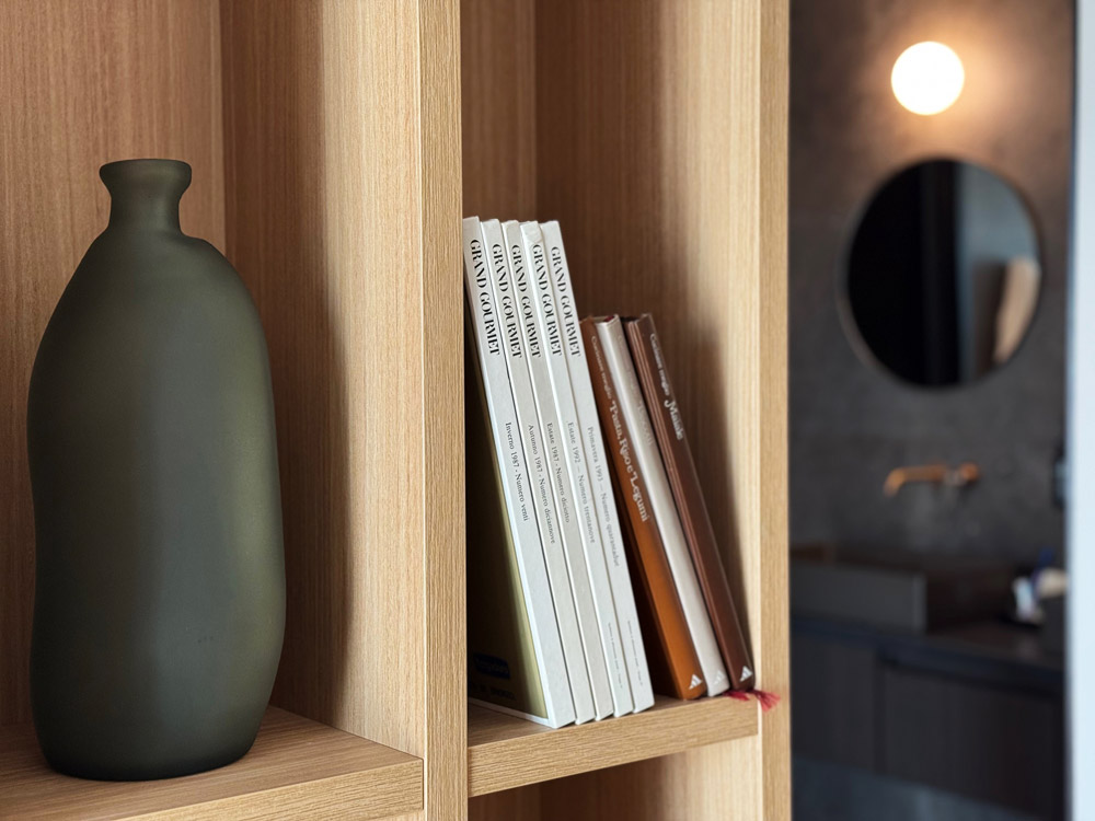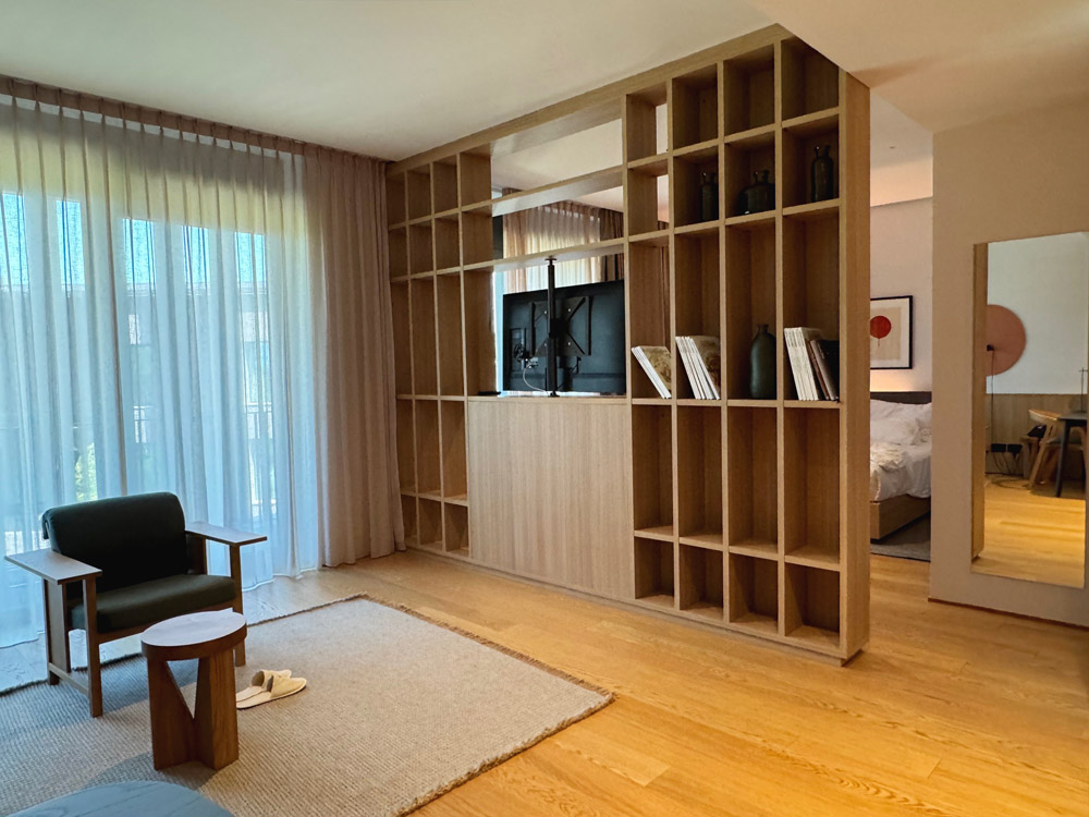 Le stanze sono distribuite in due blocchi, dal comfort delle Classic fino all’intimità delle Suite. Nella Junior Suite, lo spazio si apre con equilibrio: area giorno, terrazza sul giardino interno, letto king size e una doccia a pioggia che si trasforma in rituale quotidiano. Una cura dei dettagli di discreta eleganza.