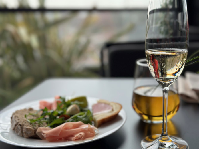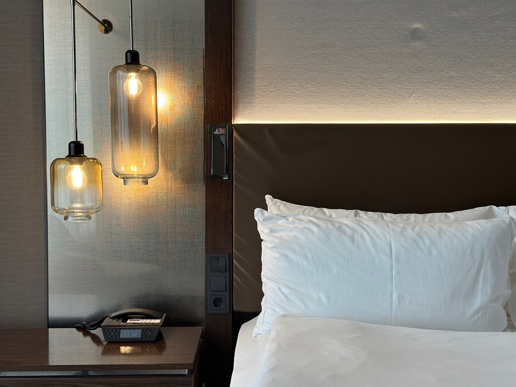 A partire dalle 165 camere, spaziose ed eleganti, dal design contemporaneo e con vista: qui ogni dettaglio è curato con attenzione, dalla scelta dei tessuti all’illuminazione soffusa, per un’atmosfera accogliente e rilassata. Il bagno, grande e moderno, divide con attenzione tutti i suoi servizi, ed offre sia la doccia che la vasca. Noi veniamo accolti con un dolce benvenuto: una bottiglia di vino locale Palamida 2021, Gašper da sorseggiare insieme a formaggi, frutta e pasticcini.