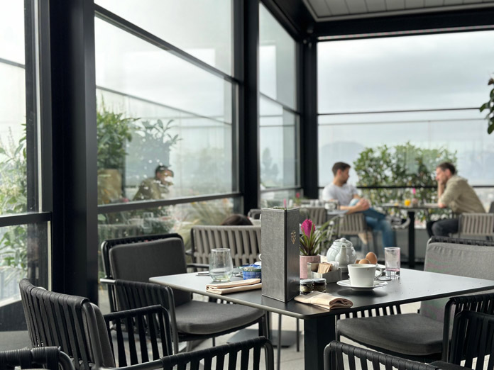 Dotato di un centro spa e fitness, oltre alla piscina coperta panoramica, propone ai suoi ospiti spazi esclusivi dove rilassarsi ammirando la città dall’alto. Anche il B-Restaurant, all’ultimo piano, regala una vista magnifica dalle finestre-pareti: specializzato in cibi locali e internazionali, offre una cucina raffinata grazie al menù firmato dallo chef stellato Alfredo Russo in un contesto contemporaneo, dove è possibile estendere lo sguardo dalla cucina a vista fino alle colline che circondano la città (leggi l’approfondimento). Qui ogni mattina viene servita una colazione rigenerante dove i piatti caldi sono serviti espressi al tavolo, mentre un ricco e abbondante buffet permette una scelta fuori da ogni aspettativa: non manca lo spumante, il prosciutto affettato sul momento e perfino il gelato!
