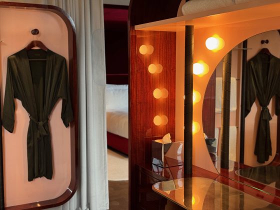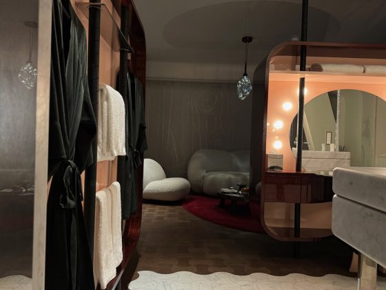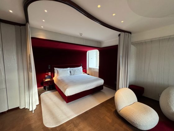 L’impatto visivo è magnetico: velluti rossi profondi, alcove avvolgenti, soffitti lucidi che catturano la luce. L’atmosfera richiama l’estetica onirica e sofisticata dei film di David Lynch – elegante, sensuale, leggermente ipnotica. Non una semplice citazione stilistica, ma un vero linguaggio visivo.
