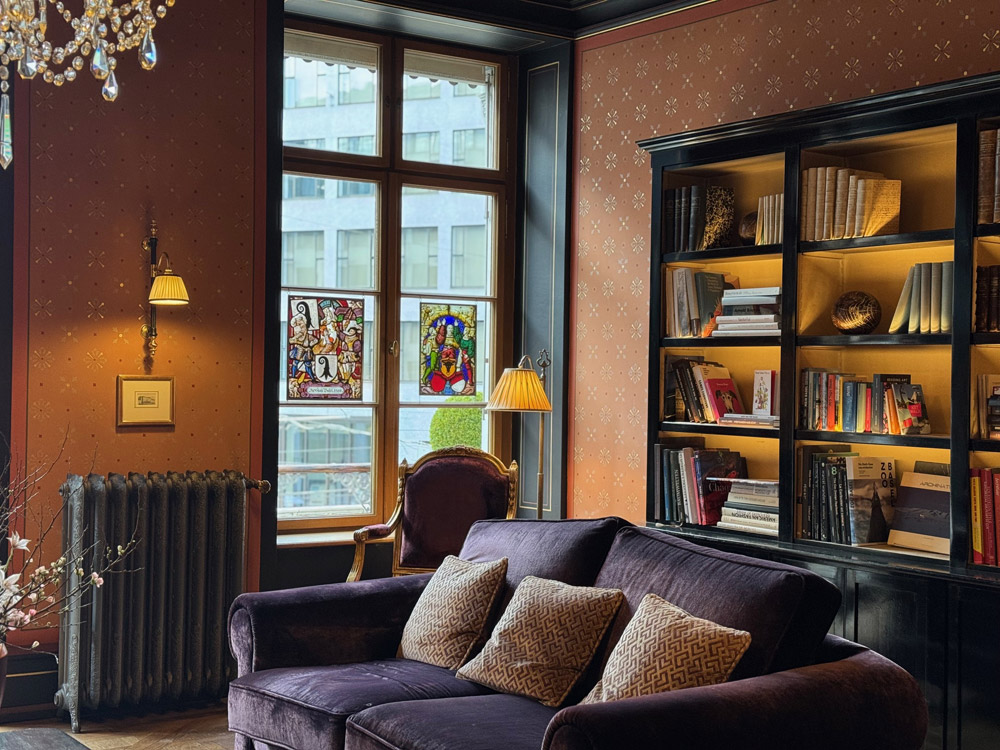 Se Blumenrain 2 rappresenta la visione contemporanea, le camere dell’edificio storico custodiscono l’anima classica dell’hotel. Emblematica la Napoleon Suite, omaggio al passaggio di Napoleone Bonaparte a Basilea. Toni verde salvia, vista sul fiume, soffitto dipinto con un cielo delicato incorniciato da stucchi e decorazioni. Il salotto d’angolo con dettagli dorati e medaglioni ornamentali sembra sospeso nel tempo. Qui il lusso è narrativo: dormire significa entrare in una scenografia storica, senza rinunciare ai comfort più attuali.