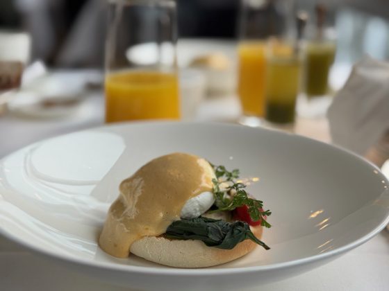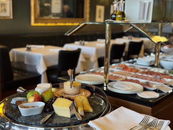 La sala colazioni guarda il Reno come un elegante salotto affacciato sull’acqua. Il buffet è generoso e raffinato: pane artigianale, viennoiserie fragranti, salumi, frutta fresca e un ricco carrello dei formaggi che racconta la Svizzera e la Francia con rigore. Alla carta anche piatti caldi come Oeuf Florentine con spinaci e Oeuf Benedict con bacon.