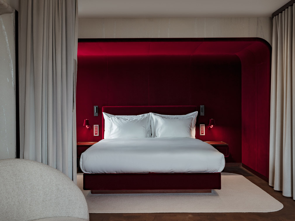 L’impatto visivo è magnetico: velluti rossi profondi, alcove avvolgenti, soffitti lucidi che catturano la luce. L’atmosfera richiama l’estetica onirica e sofisticata dei film di David Lynch – elegante, sensuale, leggermente ipnotica. Non una semplice citazione stilistica, ma un vero linguaggio visivo.