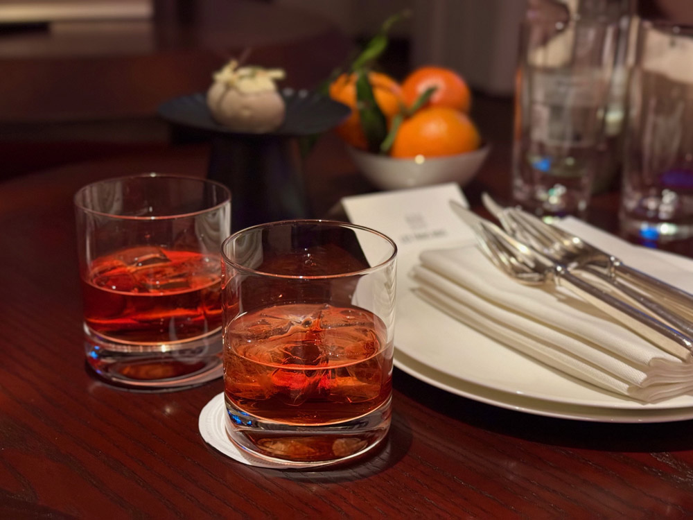 Al Bar Les Trois Rois si incontrano ospiti e basilesi in un’atmosfera di elegante disinvoltura. I bartender creano veri piccoli capolavori nel bicchiere, come l’Old Cuban (Rum / LTR Aromatic Bitter), definito con ironia “Mojito für Fortgeschrittene”, completato da un tocco di Ruinart Champagne. Stratificato, fresco, sofisticato: un cocktail che sintetizza carattere e misura.