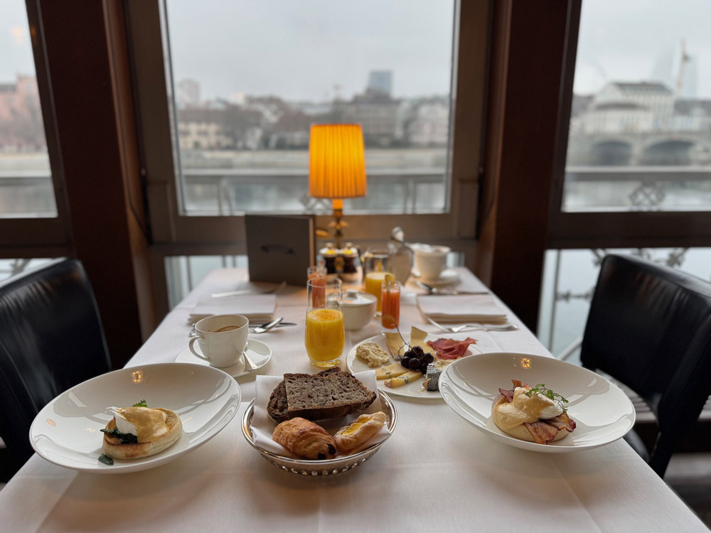 La sala colazioni guarda il Reno come un elegante salotto affacciato sull’acqua. Il buffet è generoso e raffinato: pane artigianale, viennoiserie fragranti, salumi, frutta fresca e un ricco carrello dei formaggi che racconta la Svizzera e la Francia con rigore. Alla carta anche piatti caldi come Oeuf Florentine con spinaci e Oeuf Benedict con bacon.