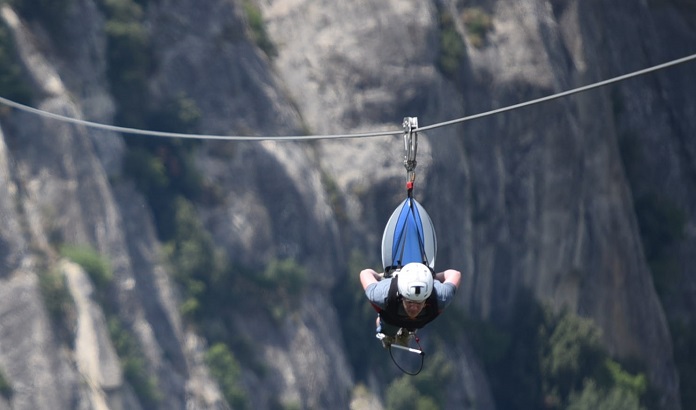 I 1452 metri di percorso durano poco più di un minuto, toccando i 120 Km/h e sfruttando un dislivello di circa 140 metri. Alla fine un enorme freno, una specie di fionda alla rovescia, ci accoglie a tutta velocità e dopo il rinculo ci deposita su una pedana dove un addetto ci aiuta a ritoccare terra. Tutta la leggiadria della planata cozza con la goffaggine dell’imbragatura, e l’adrenalina cala a picco. Ora si può passeggiare un po’ per il paese e curiosare nei suoi vicoletti, per attendere l’ora del volo di ritorno.